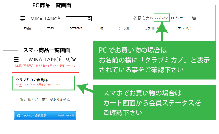 ※PCでお買い物の場合は、お名前の右横に「クラブミカノ」と表示されている事をご確認下さい。